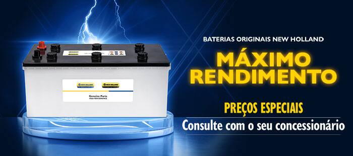 bateria New Holland é o ideal e a única que garante um equilíbrio elétrico perfeito, resistência mecânica e conformidade com o perfil funcional.